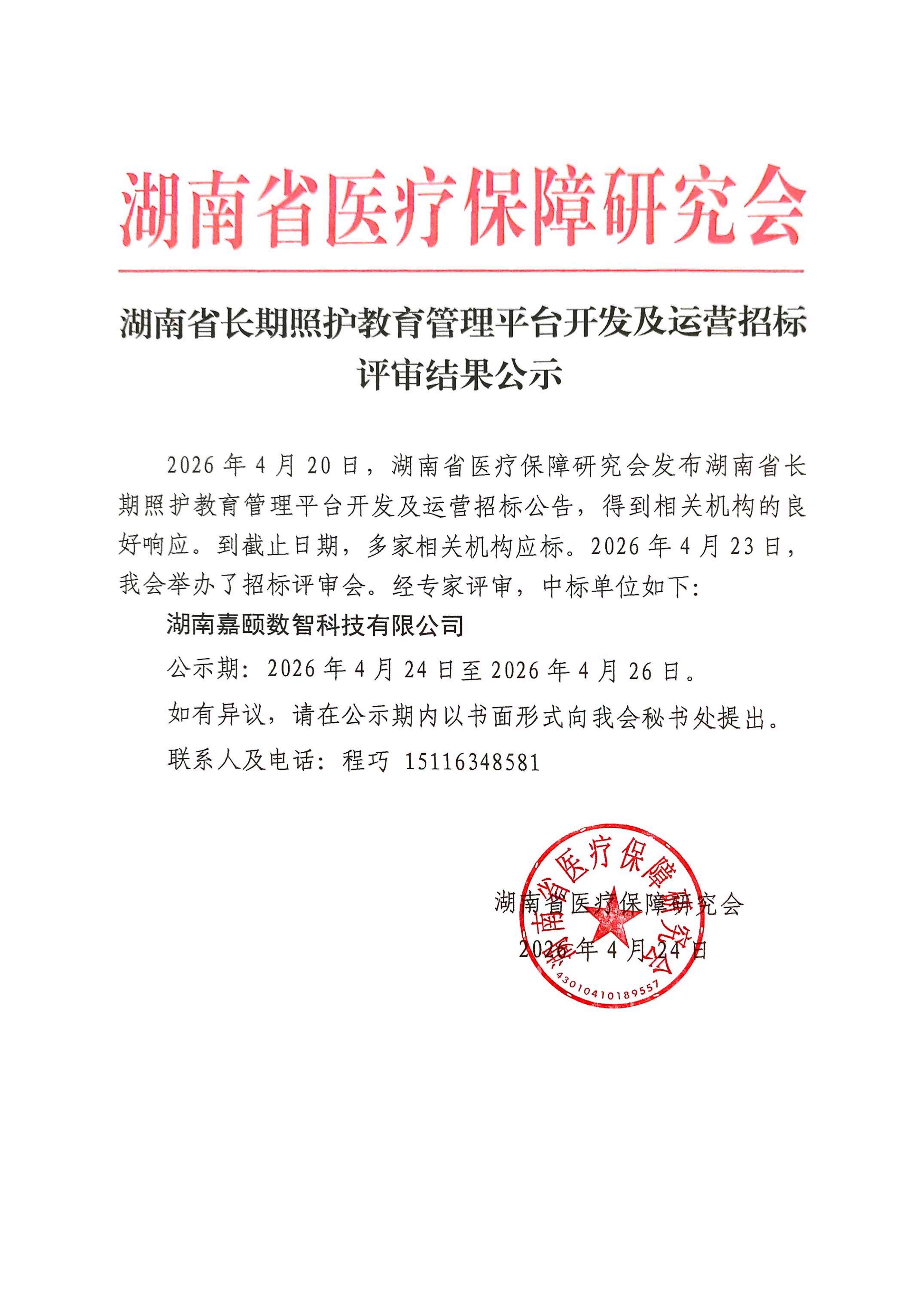湖南省长期照护教育管理平台开发及运营招标评审结果公示