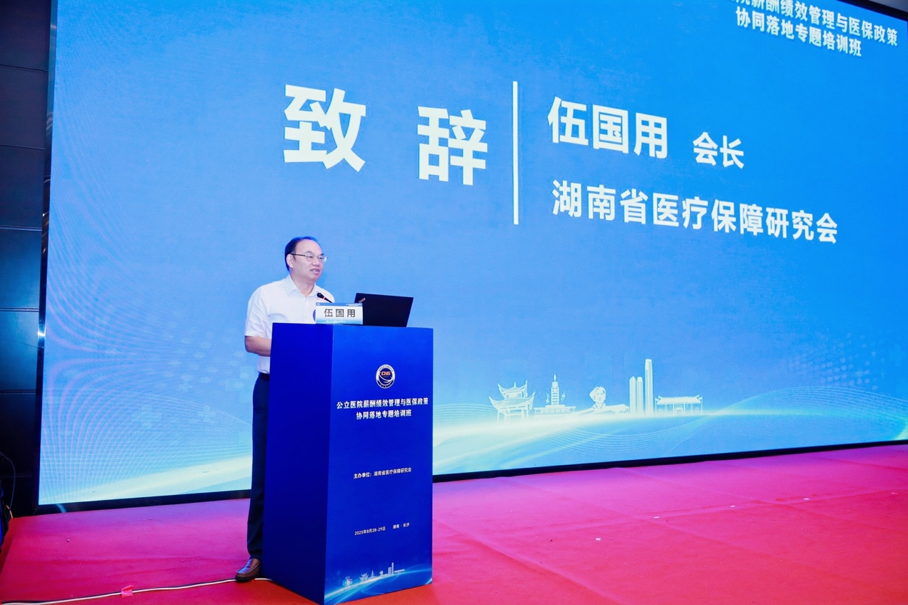 8月25日,由湖南省医保研究会主办 “公立医院薪酬绩效管理与医保政策协同落地”专题培训班在长沙举办。伍国用会长、三明市医改办主任周显葆、湖南省医保局医药价格和招标采购处副处长李跃芳以及来自全省医保、卫健系统及各级公立医院的400名代表齐聚一堂,共同探讨改革路径、分享实践经验,为深化医改、提升群众就医获得感贡献智慧和方案。同时,4000余人线上参加了学习。开班致辞环节由副会长兼秘书长周良荣主持。